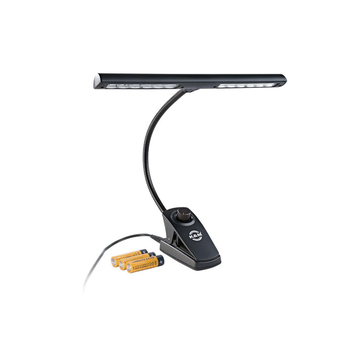 König & Meyer 12295 nodelampe med 12 energibesparende LED-pærer og justerbar svanehals. Garanterer optimal belysning. Kan bruges både med batterier og strømforsyning. Lysstyrken kan justeres med en variabel kontrol. Påsættes nemt med en fleksibel klampe der kan åbne op til 25mm. En strømforsyning med 3 meter ledning er inkluderet samt 3 AA-batterier.