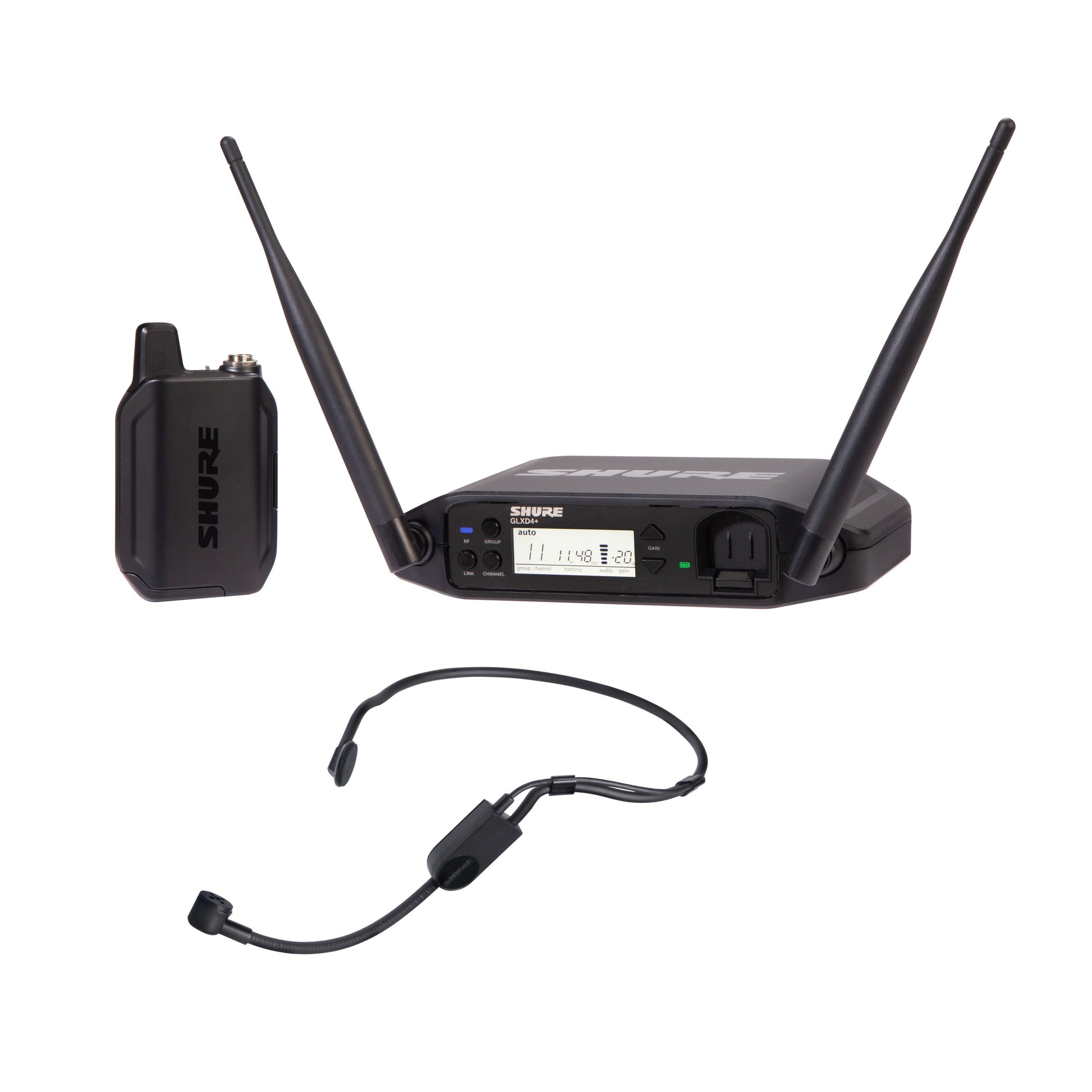 Det nya GLX-D+ Dual Band Wireless Headset System med den mångsidiga SM31FH Headset-mikrofonen för tal och GLXD4+ skrivbordsmottagare.