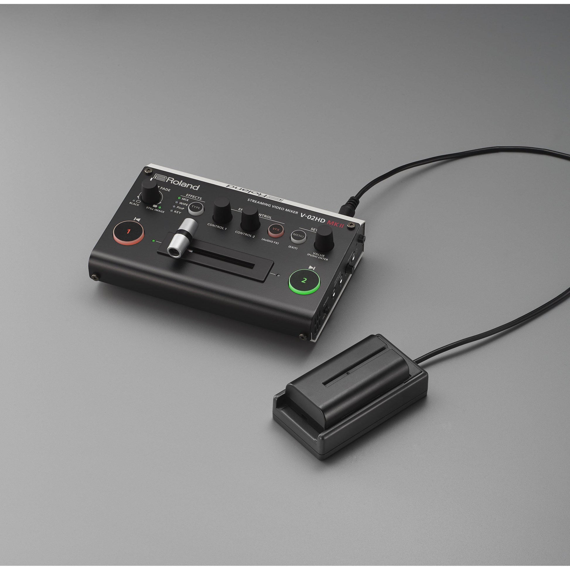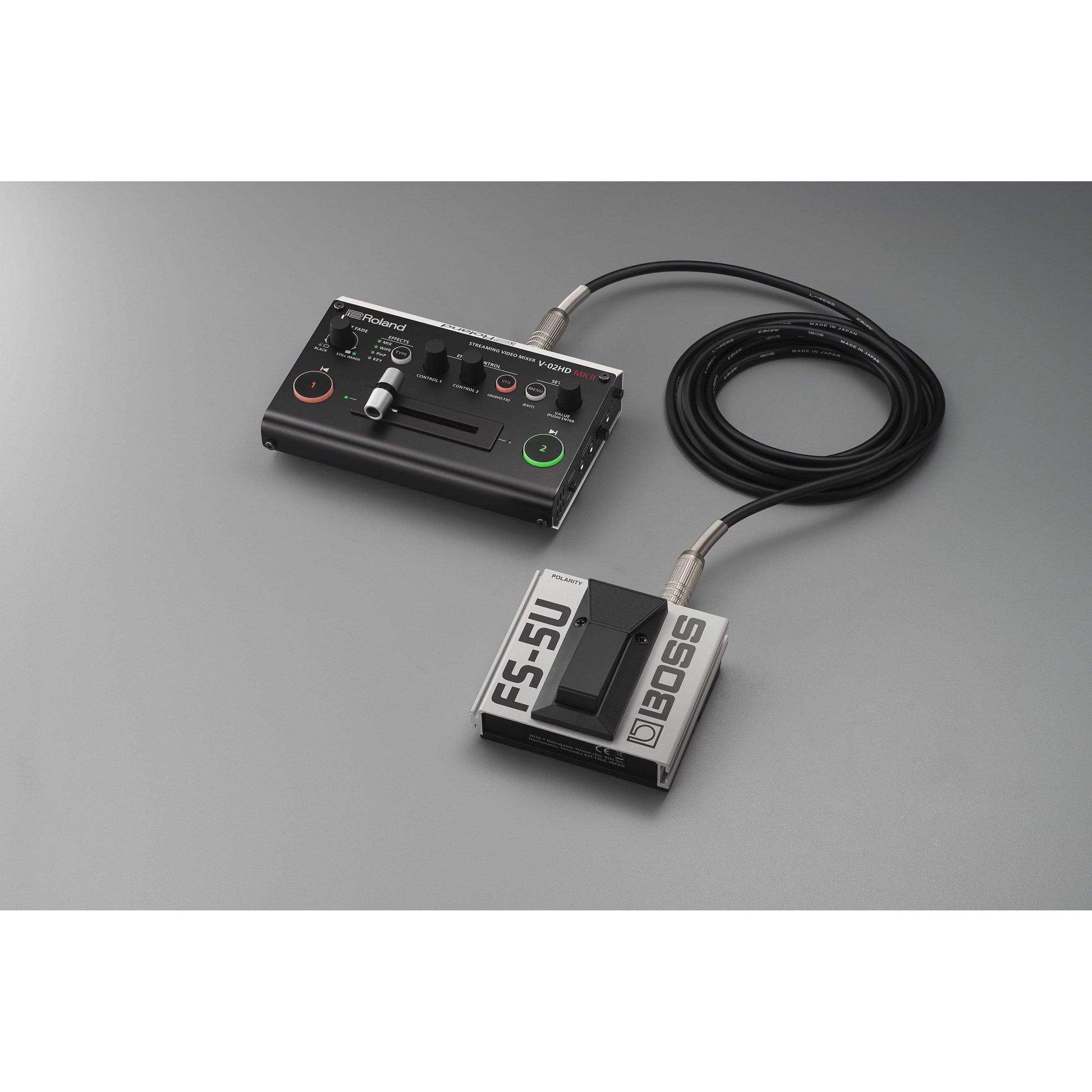 Om du ger demonstrationer eller uppträder i dina livestreamar är dina händer upptagna med den uppgiften. V-02HD MK II stöder kontroll med upp till två valfria BOSS-fotswitchar, så att du kan styra din stream utan att avbryta din presentation. Trampa på en fotkontakt för att byta kameravinklar, klippa till en statisk bild, övergångsscenlayouter, tona bild-i-bild-fönster och mer.